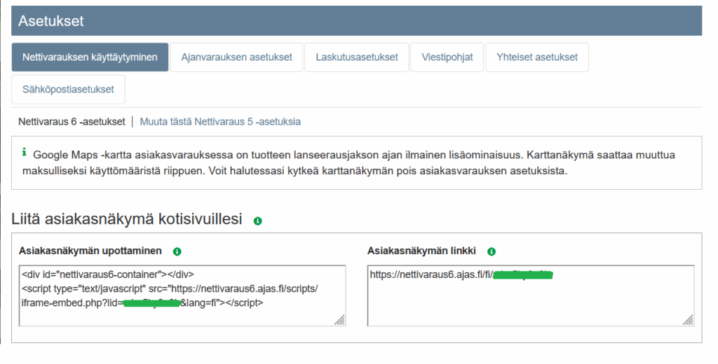 Yksinkertaisimmillaan vaihto onnistuu menemällä Ajas Touchista kohtaan Asetukset -> Nettivarauksen käyttäytyminen -> Liitä asiakasnäkymä kotisivullesi ja valitsemalla sieltä virallisen Nettivaraus 6-upotusskriptin tai linkin. Vaihda se Nettivaraus 5 upotteen tai linkin tilalle. Uusi versio ei siis maksa mitään lisää.